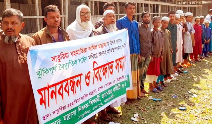 মানববন্ধনে বক্তব্য রাখেন- মাদরাসার সভাপতি মো. মুনসুর আলম, সুপার শহিদুল্লাহ আকন, সহ-সুপার ওমর ফারুক, এনামুল কবির।বক্তারা বলেন, মাদরাসার টিনসেড শ্রেণিকক্ষের উপর দিয়ে দীর্ঘদিন ধরে ঝুঁকিপূর্ণ বিদ্যুতের হাই ভোল্টেজ তাঁর গেছে।